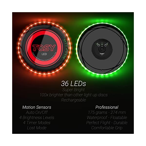 TOSY 36 and 360 LEDs Flying Disc – Extremely Bright, Smart Modes, Auto Light Up, Rechargeable, Patent-Pending, Perfect Birthday & Camping Gift for Men/Boys/Teens/Kids, 175g frisbees